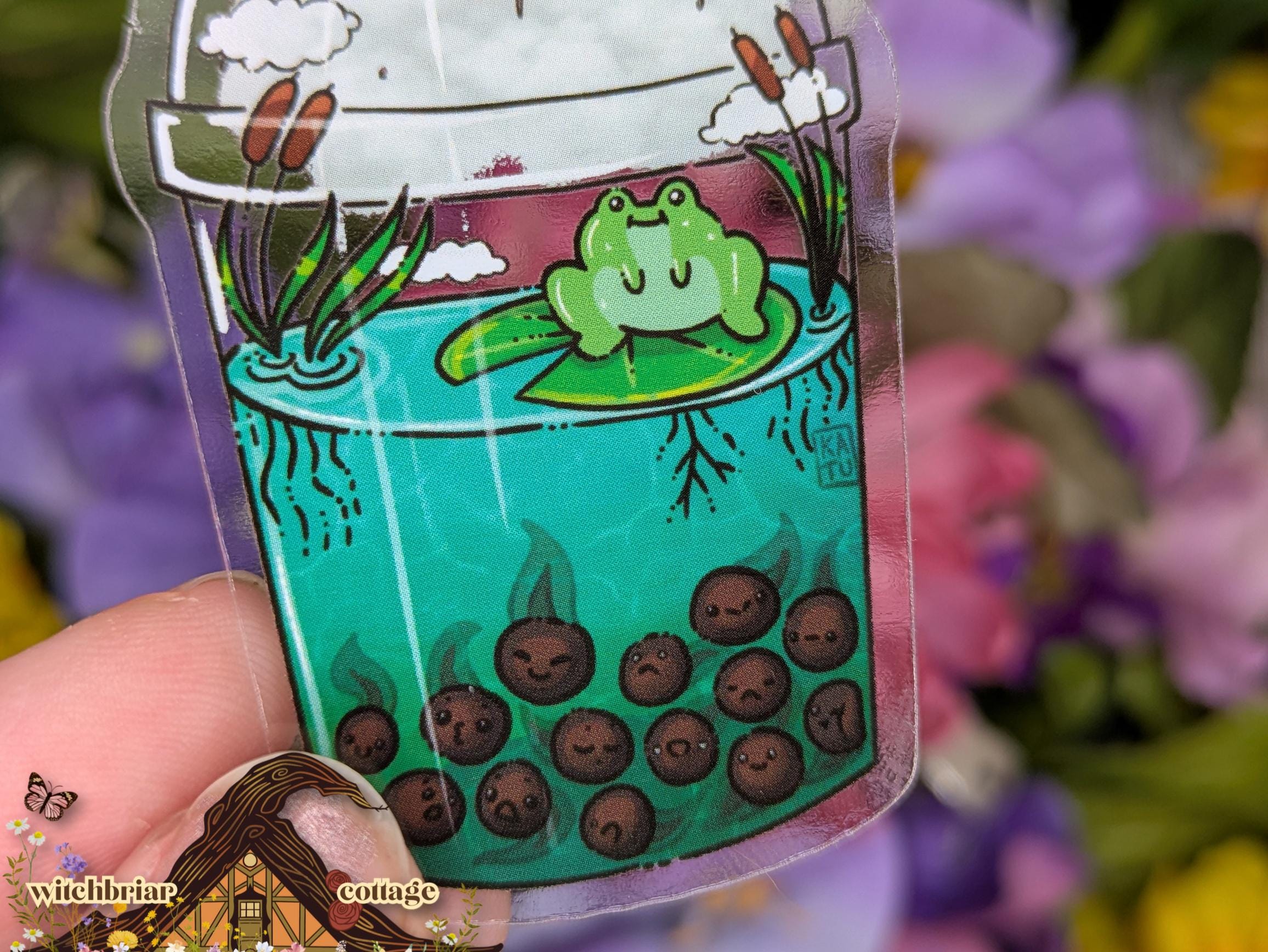 This sticker is a clear version of our Swamp Boba design!